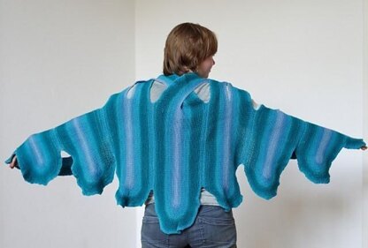 This shawl started with a squiggle. If you write “elle” in longhand you get an elegant spirited curve. Together with the long color changes of Zitron Singolo this led to the unusual construction of this shawl: my long-row technique.