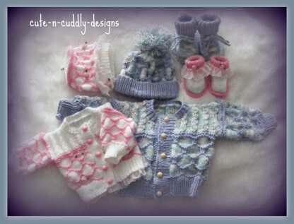 A LOVELY CARDIGAN SET TO KNIT FOR A EITHER GIRL OR BOY . AN EASY PATTERN TO DO BUT REALLY EFFECTIVE. THE OUTFIT WHEN KNIT IN 4PLY WILL FIT A REBORN 14-16 INCH OR A SMALL BABY UP TO APPROX 7LB OR WHEN KNIT IN D.K WILL FIT A REBORN 18-22 INCH OR NEW BABY UP TO APPROX 10LB
