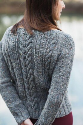 A classic cabled pullover updated with an interesting construction that gives a flattering fit. The construction is similar to Clara except the sleeves emerge from the body stitches instead of the body from the sleeves. This one is deceptively easy to knit. The stitch pattern is very easy to memorize. Get your cable on and make a pullover that you will want to live in! Sample was made the lovely, tweedy Debbie Bliss Donegal Luxury Tweed Aran.