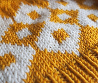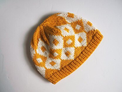 The hat is knitted in the round from the brim to the crown with a stranded pattern made of two colors.