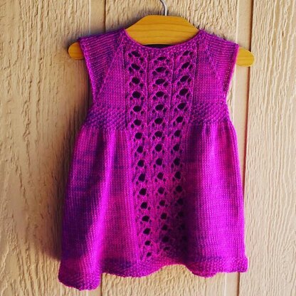 Elsbeth Ann has a vintage feel to it and will become an heirloom piece to be handed down from baby to baby. Top down construction, buttoned back, with a center lace panel and a full princess skirt. This is designed with positive ease, so there will be lots of room to grow into a tunic.