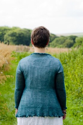 The cardigan begins by working the back flat in one piece. Stitches are then picked up along the side “seams” for each front and worked sideways to the centre. Sleeves are worked separately in the round to the underarm, then sleeve caps are worked flat and set into the body. Finally, an edging is worked around the hem, fronts, and neck in the round.