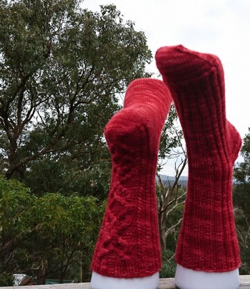 Elthia socks feature a beautiful lovers knot cable on the back leg and heel with a simple rib on the front leg and instep.