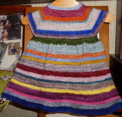 I have a bunch of Madelinetosh Merino light yarn mini skeins and I love stripe projects. So the Elyssa dress was born. A simple, classic design, so all you have to do is add your imagination. Suggestions to try: All solid, random stripes, 2 color stripes, anything you can think of. Elyssa is a top down design, with a full skirt, and cap sleeves, which can be lengthen. The button band looks good either worn in the front or back.Yarn weight