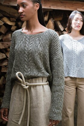 EMALJE is a slightly cropped pullover with a dropped shoulder and full-length sleeves. The front and back feature a striking pattern of traveling rope cables and eyelets over a richly textured background of mini-cable ribbing.