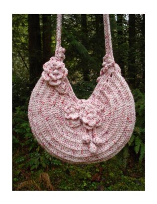 So pretty, this crocheted bag is a springtime must have. However, it would be just as fabulous in a wool yarn for winter. This bag is crocheted in two pieces (front and back) and a shoulder strap. A small pleat is formed on either side creating a gusset, then embellished with flowers, leaves and dangling buds.