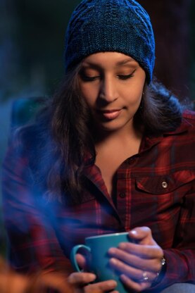 Emberly is a hat originally designed in collaboration with Earl Grey Fiber Co. for the August 2020 installment of the Indie Untangled Where We Knit Yarn Club. With its flame-like cables and columns of simple lace that resemble sparks flickering up to the night sky, this hat captures the mood of end-of-summer evenings, which involve spending time outdoors in the company of good friends and family, often around a campfire—and knitting, of course!