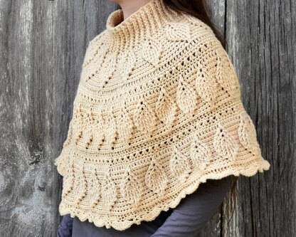 This is a crochet pattern for a lovely poncho that draws attention with the textured stitches that create an embossed fall leaf pattern. It features a stretchy, ribbed cowl neck and a pretty but unpretentious scallop and picot border.