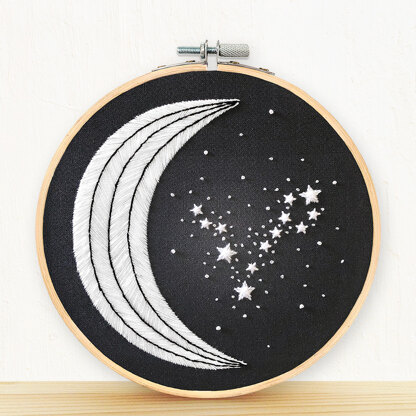 Kit contains: pre-printed fabric, detailed instruction booklet, embroidery needle, felt backing, 6" bamboo embroidery hoop, embroidery floss.