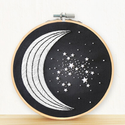 Kit contains: pre-printed fabric, detailed instruction booklet, embroidery needle, felt backing, 6" bamboo embroidery hoop, embroidery floss.