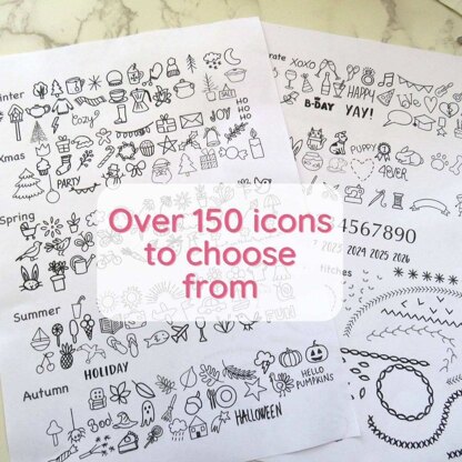 Beautiful, Colourful and Fun Hand Embroidery Designs Discover your next stitch journey.\n\nHere at Stitchdoodles we are all about creativity. Sitchdoodles was created in 2019 after I was finding it difficult to find hand embroidery patterns that were exciting and a bit different from the usual. Wanting to combine our love of hand embroidery stitches, traditional sampler techniques as well as quilt designs(!) I decided to come up with something myself and it has evolved into an array of wonderful and colourful designs that will hopefully inspire and excite people to pick up a needle and get 'happy stitching’.\n\nWhat you will receive:\n• This pattern is available as a PDF download so you can access the pattern as soon as you would like.\n• Each pattern comes with details on the colors, threads, and materials required.\n• Easy to follow instructions are given along with full-color photos.\n• All templates are provided actual size.\n\nYou can do just that with the Embroidery Journal 'made easy' by Stitchdoodles.\n\nThere are 2 templates for you to choose from each with 12 divisions so you have some stitch space to fill in each month.\n\nAlong with the templates, there is a 'How to Guide' included as well as over 150 hand drawn icons ready for you to choose and stitch.\n\n…so if you are completely new to the whole concept, you will be stitching your journal in no time. Find out…\n\n How to transfer the motif to your journal fabric\n Lots of ideas for what to include in addition to the 150 hand drawn motifs provided.\n Where to find designs and motifs – perfect for people who don’t draw.\n Which embroidery thread to use.\n Which stitches to use.\n How to fill the empty space.\n\nTHIS IS A PDF PATTERN FOR 2 TEMPLATES SO YOU CAN TRANSFER TO FABRIC YOURSELF.\n\nPLEASE NOTE - THIS IS NOT A PATTERN - it is for you to fill in the templates yourself by adding small little icons or motifs that represent things that happen in your weeks and months. You can read all about stitching a thread journal, on the blog here>\n