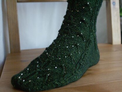 Leafy goodness! Twisted stitches, lace, cables and beads.. all the stops have been pulled for this sock, which is worked from the toe up. The interesting bits start right away at the tip of the toe. Sock is sized for average women's foot. Stitch patterns are presented in chart form only. Socks are beaded using the crochet hook add-as-you-go method.