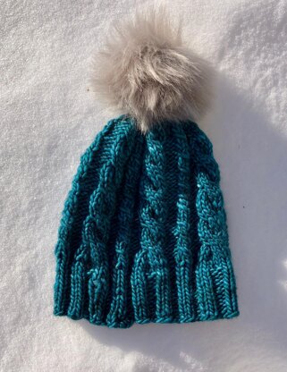 *This hat is inspired by the beautiful but cold snow & ice outside my window. The Faux Fur Pom Pom is bought separately and is optional. It is knit in the round, seamlessly from the bottom up. Cables throughout give it some beautiful texture. *