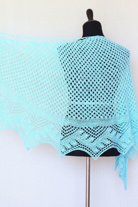 Emery is a crescent shaped shawl knitted top down. The border is knitted afterwards and attached to the body stitch by stitch cross-wide.