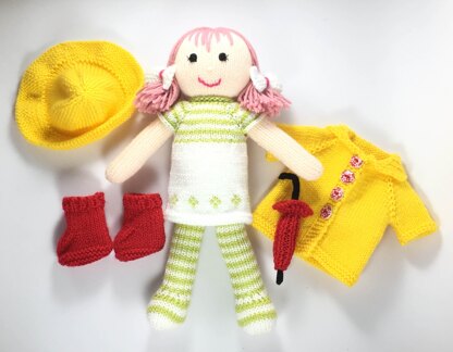 Emily knitted doll pattern ready for the rain with her raincoat, rain hat, boots and umbrella.