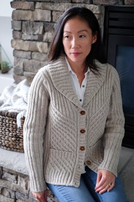 Cardigan is knit bottom up in pieces and seamed. Button bands and shawl collar are worked from stitches picked up along fronts and neckline edges. Shawl collar is shaped using short rows.