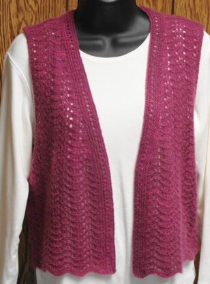 Emma is a light, airy vest that can be worn all year long. The yarn over border pattern can turn into a button band by simply sewing buttons onto a lace hem tape and "popping" them thru the holes.