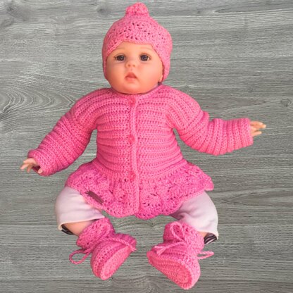 Create a coordinated baby cardigan, hat and booties set with a round-neck and peplum frill design. The cardigan is worked from the bottom up, then turned to work the peplum and the hat and booties are worked in the round for a polished finish. The sweater set is ideal for everyday wear and special occasions, with booties sized by hook for flexible fit.