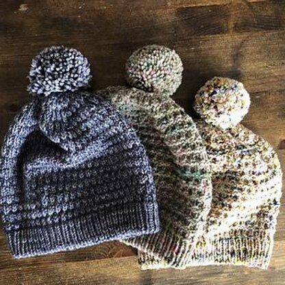 Emmi is a casual hat, worked in the round from the folded brim to the top. Broken rib stitch is used for the entire body of the hat with decreases worked into pattern to keep them as invisible as possible. An optional pompom (to use up the very last bit of the skein) is worked last. Both the RS and the WS of the hat are very beautiful - weaving in the ends carefully, as invisibly as possible, and maybe using a detachable pompom will offer you the option to wear this hat WS out too.