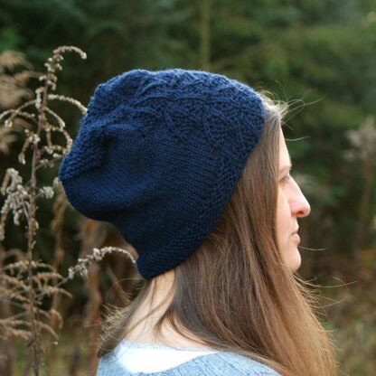 Emmi is a slouchy beanie/toque with a garter stitch brim and crown. An umbrella-like pattern runs up above the right eye, the rest is simple stockinette stitch. Emmi is casual and yet feminine. This pattern is great for beginners and knits up quite fast.