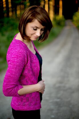 “Endearment” is a romantic, delicate and very feminine cardigan, looking equally flattering over a light summer dress or paired with your favorite jeans. Worn open or buttoned, it is visually slimming by way of combining Hanna’s signature entirely seamless construction with just the right amount of added waist shaping, eliminating bulk in unwanted areas. The intricate cable and lace pattern over the fronts looks much more complicated than it actually is, but is easy to knit, especially since it is all charted. Longer hems and cuffs with decorative splits, a novelty for Hanna’s style, are sure to please everyone looking for “that special extra” in a new cardigan!