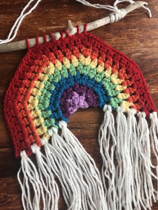 You will need a small amount of DK (8-ply/light worsted) weight yarn, 4.5 mm hook and a wooden dowel/drift wood to hang your rainbow.