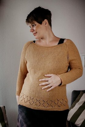 Enny Blus Basic for Women is knit top down in a seamless construction. You start knitting in the round at the neckline. The sleeves are put on hold, while you finish the body. Then, the stitches on hold for your sleeves are put on the needles again and knit in the round.