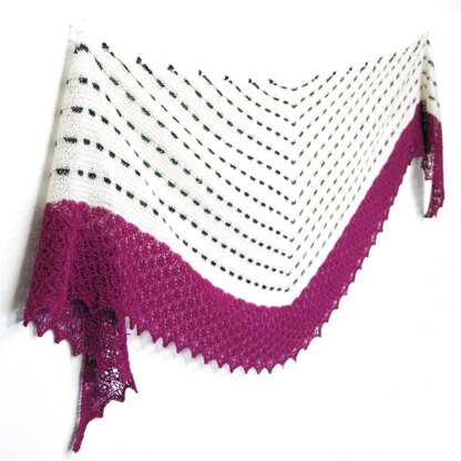This feisty three-color shawl was inspired by the pitaya or dragon fruit. I was fascinated by the contrast of the black-and-white texture of the fruit itself against the vibrant, pink rind. How can something like this occur naturally?
