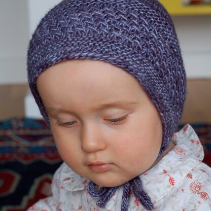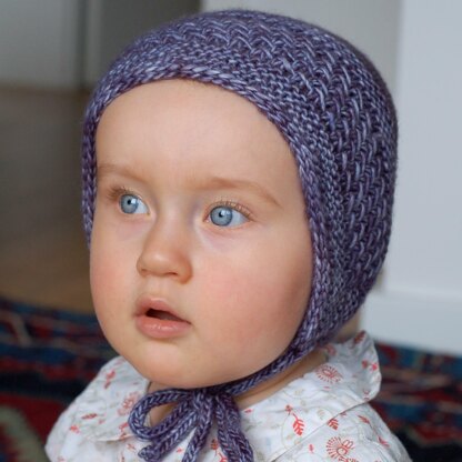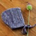 **CONSTRUCTION:** This bonnet is knit seamlessly. The front of the bonnet is knit flat, featuring an easy textured stitch; the crown is knit in the round after the back neck is finished by a three-needle bind off. An applied I-cord and I-cord ties are worked on the neck portion, then an applied I-cord is worked around the front to cinch in the fit around the face. **SKILLS REQUIRED:** cast on, knitting, purling, decreasing, working an easy texture stitch, working I-cord and applied I-cord (explanations provided), yarn over, 3needle bind-off