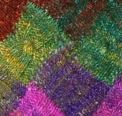 This is a wonderful pillow pattern we used in an entrelac workshop in my yarn shop. It was a great class and we had a fun time seeing the pillows in all different colorways at the end of the workshop! Noro Silk Garden Sock is a dk weight silk/wool blend with a slightly uneven texture and is available in the inimitable colorways that Noro is known for. The front of the pillow is entrelac with a cable in each square. The back of the pillow is reverse stockinette stitch. There is an i-cord piping around the entire pillow seam.