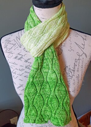 Yarn: Sock or Fingering weight. 100gr, 460 yards. Single skein or 5 mini 20gr skeins 92 yards each. Shown is Apple Martini by Haute Knit Yarn. (Ask for it by name). Gauge: 30 x 28 = 4 inches. Knitting needles: 3-3.75mm. I knit continental and used 3mm. Finished dimensions: 58 x 6 inches Blocked. Loose long tail cast on (using 2 needles) , loose yarn over bind off.