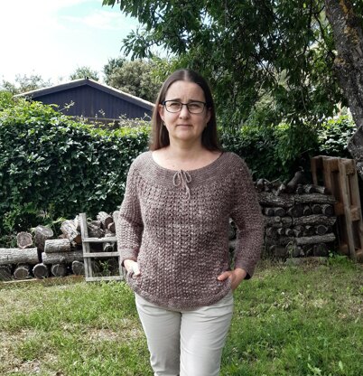 Epeautre is worked from top down, beginning at the neckline, in garter stitch, with a little front opening. The yoke is then worked in the round and in lace. Afterwards, sleeves and body are worked separetely and in the round too. They are ended by a garter stitch border.