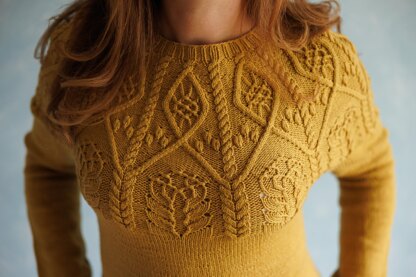 Sweater is knitted seamlessly from the top down with a round yoke, beginning with a ribbed crew neckband. The patterned yoke features cables, lace, bobbles, and cluster stitches to create the flower heads and fruits. The yoke pattern continues over the fullest part of the chest, and the sleeves are divided at the underbust. Then the body and fitted sleeves are worked straight in stockinette stitch down to the ribbed edges.