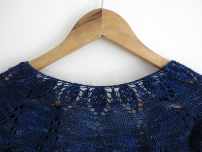 This cardigan is knitted from the top down using a yoked construction. Charts and written instructions are given. Check all measurements below before deciding what size to knit. Note that this shrug has about 1” negative ease - for a looser fit go up a size.