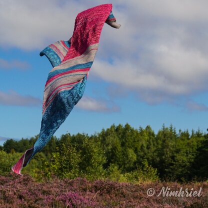 Erica is a triangular shawl knitted sideway with different kind of lace and stripes. It measures approximately 140 x 160 cm / 55 x 62 ½”, wingspan 212 cm / 83” (washed and blocked).