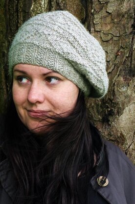 The slouchy hat is knitted in the round using an aran-weight with good drape and stitch definition.