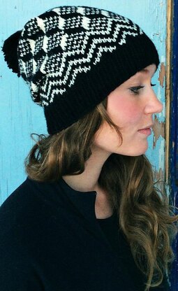 This hat is named after Maurits Cornelius Escher better known as M.C. Escher. The design was inspired by his transformation woodcuts and by his Metamorphosis I Woodcut in particular. If you look at the body of the hat, the blocks might be facing up or down depending on the viewers perspective. This theme is common in many of Eschers works which play with the viewer’s perception of reality. The hat itself would look nice in many different contrasting colour combinations and is not a difficult knit.