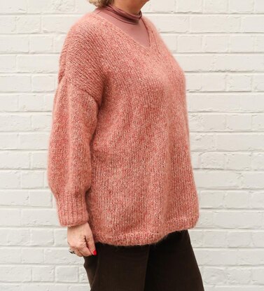 The Esme sweater is an easy beginner friendly fluffy sweater, knit in panels holding 3 strands of yarn together to create a gorgeous marbled color. It has wide sleeves with a tight cuff and a very easy V neck.