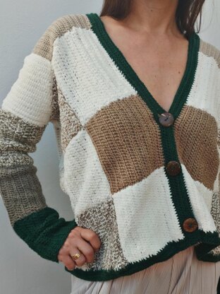 The cardigan can fit several sizes. The pattern shows two options, one for S/M and one for L/XL. In any case, since it is a garment made with the patchwork technique, the pattern explains how to adapt the measurements to create other different sizes.