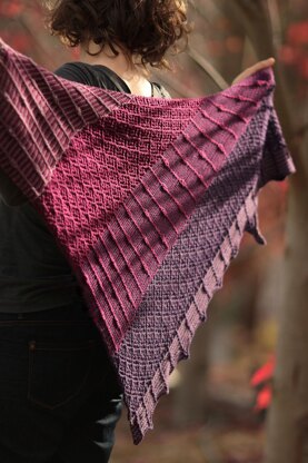 Espaliered is a textured, asymmetric triangle. The body of the shawl is worked sideways, and alternates between bands of lace and sections of striped garter with slip stitch lines. This creates an intriguing, textured effect reminiscent of branches trained to grow across a garden wall.