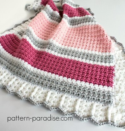 This blanket has an interesting texture and beautiful border that elevate it from an ordinary one. I designed it in bold stripes of color, but you can adjust the stripes however you like or make it solid too. It works up so fast and is so soft in this bulky yarn (the whole thing took me 5 hours). It’s easy to adjust sizing too, so you can make it smaller or larger!