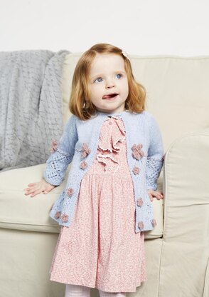 This children's cardigan is worked with raglan shaping and from the top down. It has a two-button closure at the neck, a woven waist detail, and crocheted and/or knitted floral appliques. The lace pattern can be worked either from charts or written instructions, whichever you prefer.
