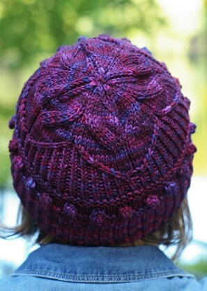 This whimsical hat is as enjoyable to make as it is to wear! It feauture bobbles, twisted stitches and a lacy crown. These elements combine with folded brim create a perfect hat for fall weather!