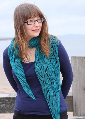 An estuary is an in-between place, not ocean, yet no longer river. It is a fertile habitat where sweet and salt water mix,and many species thrive. Estuary combines two lace patterns to create an ambiguous shape: not quite a shawl, yet something more than a scarf.