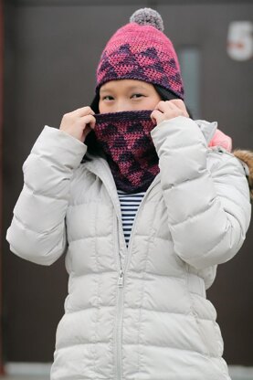 The Euclid Cowl is a two-color tapestry crochet cowl worked in sport weight yarn. The pattern comes in two lengths: the shorter version shown, and a longer version that can be wrapped twice for extra warmth. The cowl pairs with the Euclid Hat for a matching set and uses American crochet terms.