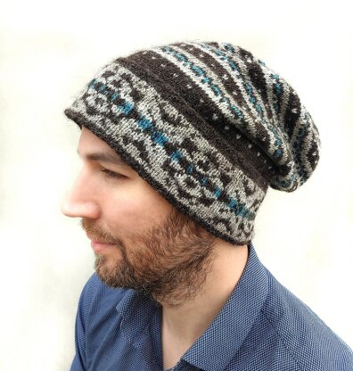 It is knit in the round from the edge of the brim and then is turned inside-out to work the rest of the hat. You may like to add a tassel at the top.