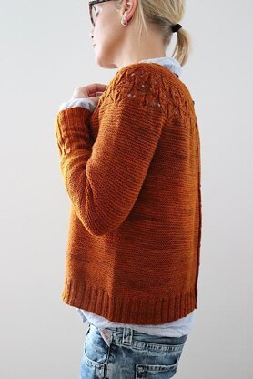 Eula is worked seamlessly back and forth in Garter stitch from the top down with a cute buttoned back. First some short-rows are worked back and forth to create a higher back neck and then the yoke is worked top down to sleeve separation. Some last short-rows are worked to finish the yoke shaping right before sleeve stitches are placed on hold, then the body is worked down to the ribbing. Sleeves are worked top down to the cuffs last. No additional finishing required. If you plan to use larger buttons than the recommended size, please allow more rows between each buttonhole.