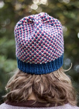 Europa is a colourful hat that uses stockinette brioche in three colours. This gives a lovely, thick fabric with a pleasing stitch pattern on both sides. The pattern is very flexible and can be made in a range of sizes with different yarn weights, ranging from fingering to bulky.