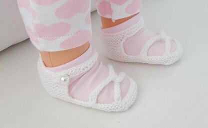 These 3ply garter stitch baby sandals have a buttoned ankle strap and linked toe straps.