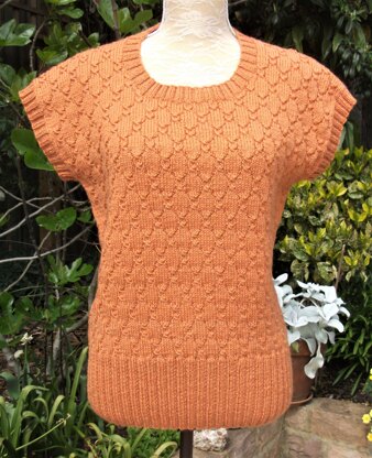 A useful, fashionable tank that can be worn alone or as an over-top. The main stitch forms alternating raised medallions and produces a really attractive, texured pattern, which is very enjoyable to knit.